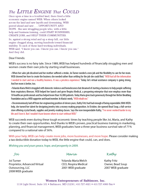 Donor appeals In tough economic times, Susan's appeals take an upbeat, creative approach. Here we cast WEB as the “Little Economic Engine that Could.” WEB supporters said they thought this annual giving letter creatively captured the true spirit of the organization. (Graphic design by Glenn Write service partner, Visual Arts.) |
