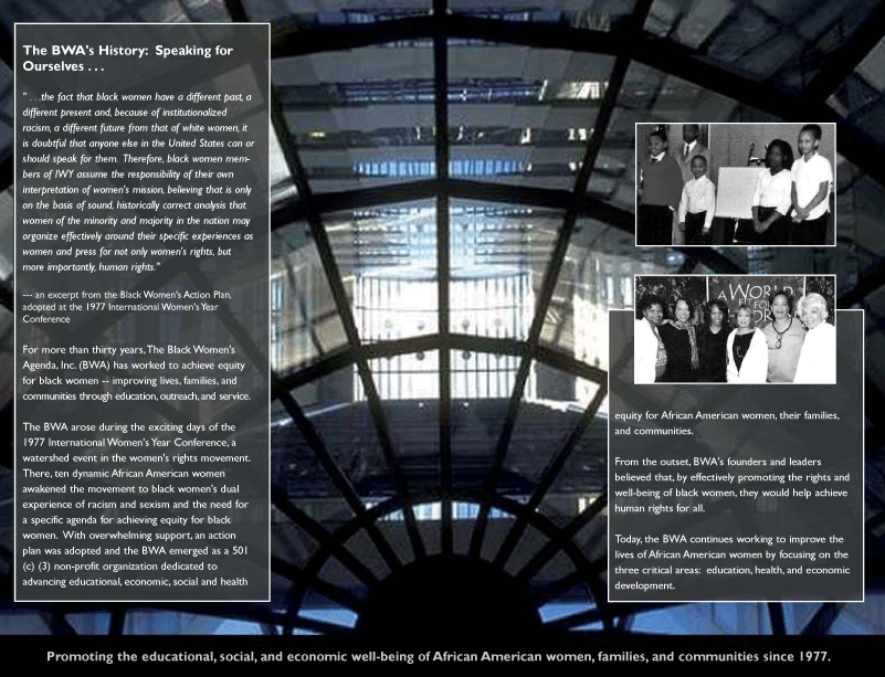 Marketing materials An inspiring national grassroots organization, the Black Women’s Agenda needed to update its decades-old marketing materials. After reviewing dozens of program documents, Susan boiled down their core message into this compelling case for support. A new tagline “Speaking for Ourselves” emerged in the process, reminding the organization and its supporters of BWA’s role in the African American community. (Graphic design by MZ Addy, a Glenn Write service partner.) |